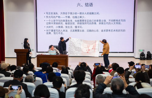 讲座中,朱以撒教授从最朴素的“写”切入,指出书写是言谈情思的载体,普通书写重在清晰准确,而书法则是有章法、有审美的艺术。他援引金人赵秉文、明人许学夷的观点,阐释师法古人、临摹经典的重要性,并分享习书心得:唯有坚持日常书写,在积累中提升技艺与审美,才能既摹其形、又得其神,在与古人的精神对话中涵养气韵与格调。接着,他将“写”的话题从“写字”延展到“写文”,提出书写可锤炼语感、积淀文思,促使文字成为更有深度、更富才情的文学表达。主讲人以王羲之《兰亭序》、颜真卿《祭侄稿》、苏轼《黄州寒食诗》等文书兼美的原创之作为例,强调古人对艺文兼修、兼备、兼精的追求值得后人学习。讲座尾声,朱以撒教授现场展示了其个人创作的拓片题跋若干幅,这些气韵生动、洋溢着文人风雅的作品,直观展示了书写艺术的魅力。