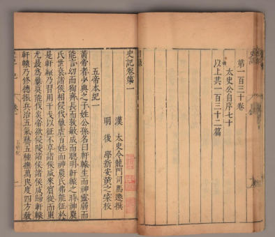 《史记》共一百三十卷,由“十二本纪、十表、八书、三十世家、七十列传”组成,全书130篇,约52万多字。它是中国历史上第一部纪传体通史,位列“二十四史”朝代顺序的第一部。其记载时间之长、内容之广,前无古人。全书上起传说中的黄帝,下迄汉武帝太初年间,约三千年的历史,尤详于战国、秦、汉时期。