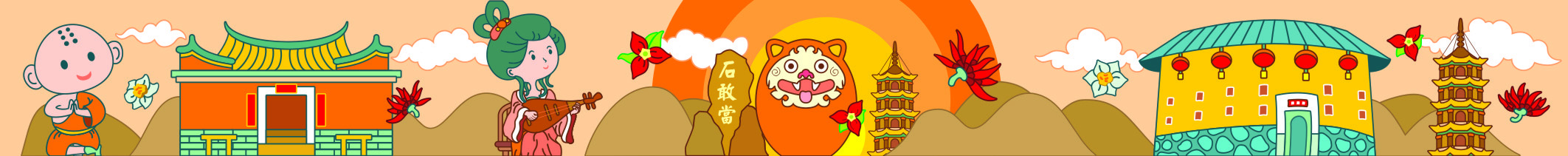 本款设计使用了富有闽南特色的南少林、闽南古厝、南音演奏、石敢当、泉州东西塔、福建土楼、闽南三地市花(刺桐、水仙、三角梅)等本土元素,结合纸胶带的受众特点及适用场合,以卡通风格进行创作。画面以暖色调为主,烘托出闽南地区深厚的传统文化底蕴与历史积淀。