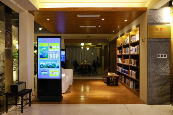 沿山道蜿蜒而上,“八闽书房”元素在山居各处呈现。从户外导览、门前的灯箱、玻璃门上的贴纸,到内部陈列的各地文化书籍,八闽文化元素被自然融入山居的各个角落,使自然景致与人文氛围相得益彰。于此,既可远眺福州万家灯火,亦可静心品读八闽文化,令此处成为集文化展示、阅读休憩与观光功能于一体的特色空间。