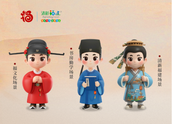 “八闽书房”IP形象以古代书生形象为原型,基于现代人对传统书生的理解与想象,通过现代化、符号化再创作,传递“穿越千年的风雅”,配套有适配于书房勤学、清新福建、福文化三大核心场景的不同服饰,既保留书生的文雅特质,又深度融合福建文旅元素,使闽人闽书闽事闽智慧以生动姿态走进百姓生活。