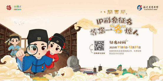 本次活动分为“名称征集”“名称初筛”“人气名称推选”和“征名结果公布”4个阶段,征名结果将于2026年4月23日公布。即日起至2025年12月31日,公众可线上参与“名称征集”,搜索微信公众号“福建省图书馆”,点击右下角“活动资讯-IP形象征名”菜单进入征名活动快捷通道,或扫描线下服务阵地的活动海报二维码,即可获取更多活动详情;投稿要求为提供4字以内的“八闽书房”IP形象名称及对应的数字人唤醒词(ABAB组合为佳),并附约200字的设计理念说明。