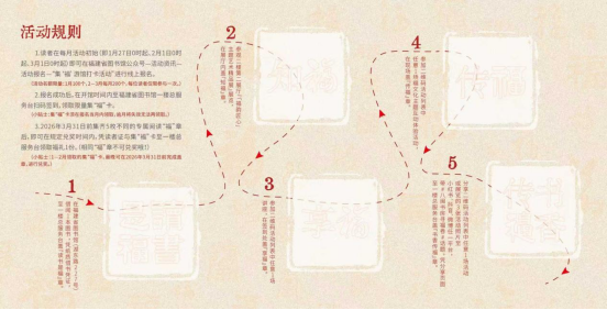 本次活动以“福韵八闽 书香传福”为核心,串联起“福韵匠心”主题艺术精品展、纸伞传福·彩韵油染、坊巷福话·读书会、正谊影院迎新春观影会等20余场特色“福文化”主题活动。读者报名成功后,可至福建省图书馆一楼总服务台扫码签到,领取限量集“福”卡,通过在福建省图书馆及“八闽书房”公共阅读新空间省级试点借阅一本好书、参观一场展览、聆听一场讲座、参加一次互动体验、分享一次心得,收集“读书是福”“知福”“享福”“传福”“书香传福”五枚不同款式的专属阅读“福”章,在“阅读集福”中感受八闽“福文化”的独特魅力。